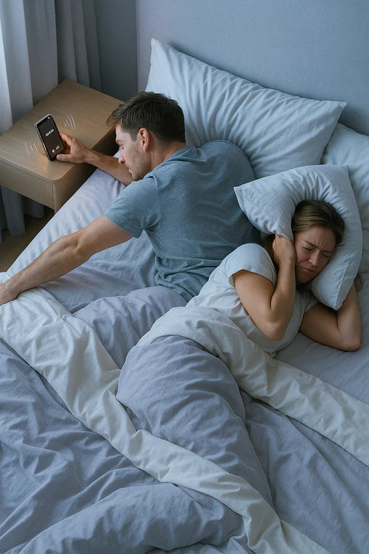 Inga fler morgnar fyllda av dåligt samvete eller frustrerade suckar. Sovbandet™ väcker dig tyst – utan pip eller surr – så att din partner kan fortsätta sova ostört.